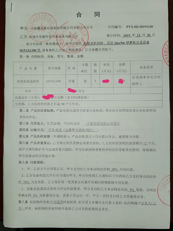 我司三年后與老客戶寧夏鵬昱新環(huán)??萍加邢薰驹俅魏献魑宜拘滦透咝u流選粉機SEPAX1500型,配套直徑3.0米球磨機使用。
